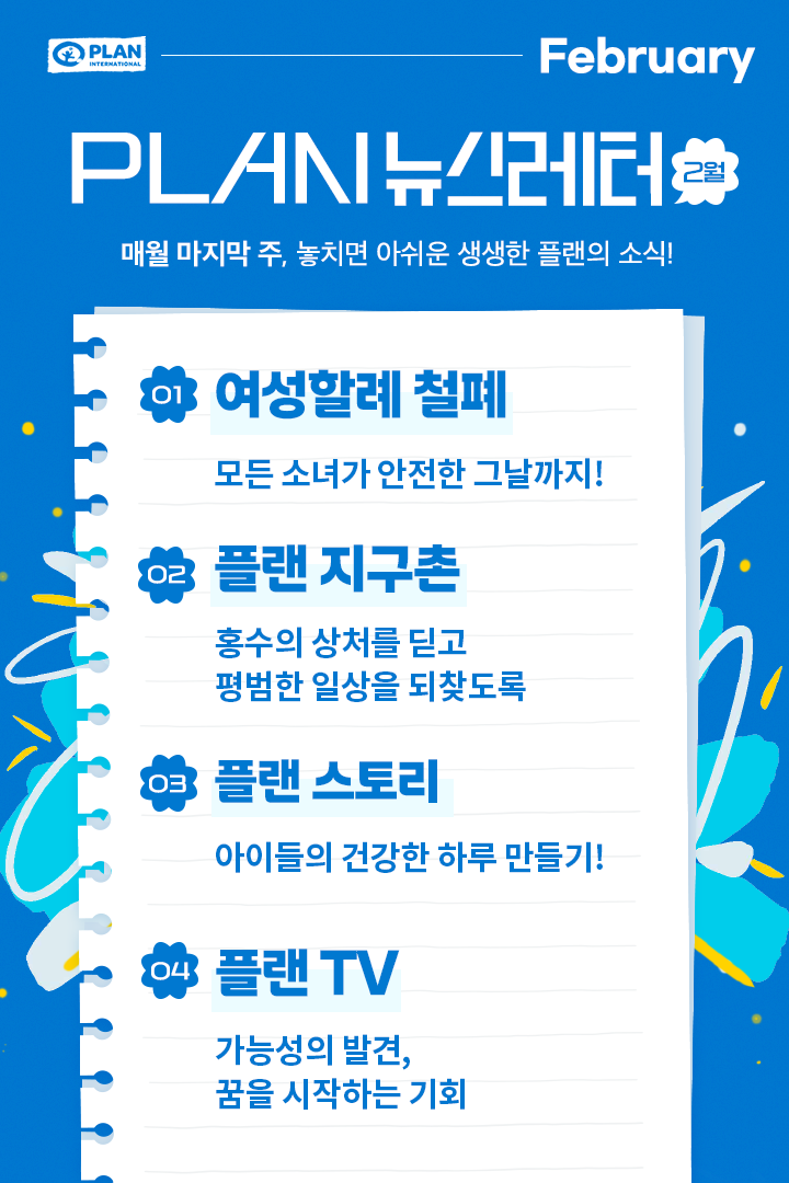 2월 PLAN NEWS 1.[여성할례 철폐] 모든 소녀가 안전한 그날까지! 2.[플랜 지구촌] 홍수의 상처를 딛고 평범한 일상을 되찾도록 3.[플랜 스토리] 아이들의 건강한 하루 만들기! 4.[플랜 TV] 가능성의 발견, 꿈을 시작하는 기회